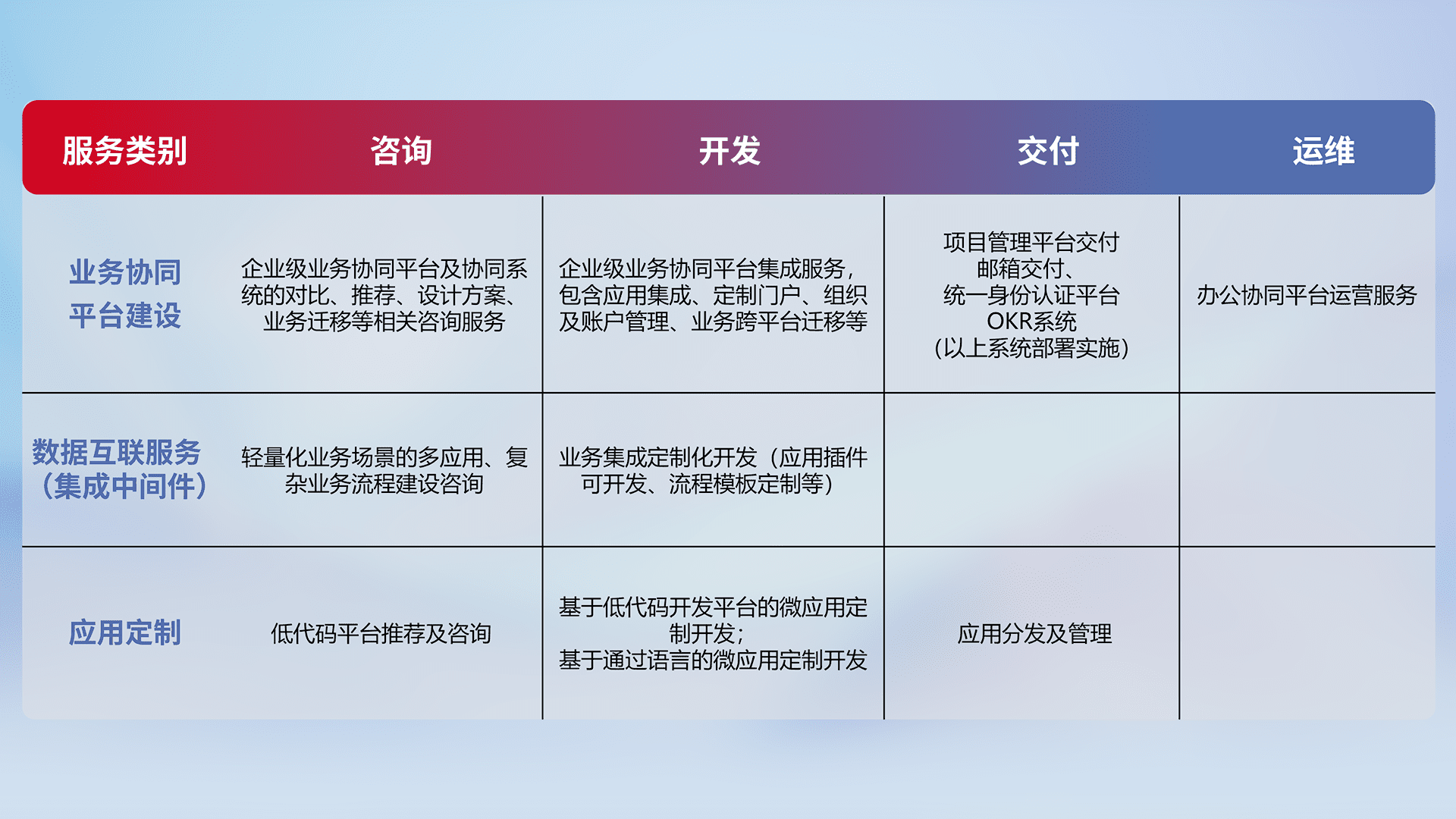 针对钉钉、、、、企微、、、、IDaas等平台级产品提供产品的规划、、方案、、、、交付、、、定制化开发等服务,,,实现如统一协同办公、、、智能客户服务、、混合会议管理、、、、智能数据查询、、等业务场景,,,,实现数字化转型。。。。
