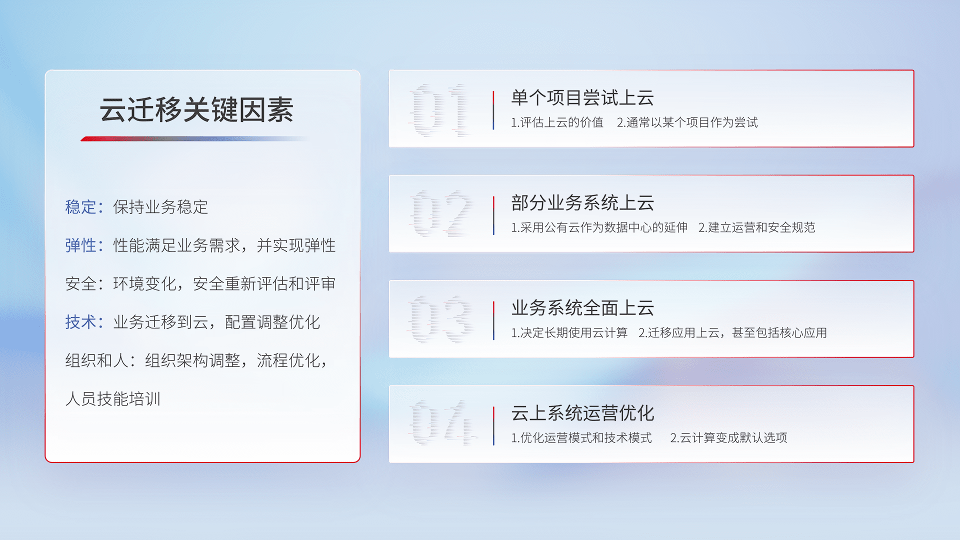 结合实际业务,,,从规划设计、、、云平台选型、、、云原生改造、、数据迁移、、集成交付,,迁移全过程为客户识别最佳上云路径,,,做好风险识别管理,,设计网络架构、、、、身份权限、、安全审计合规、、、、操作审计、、、日志审计、、、监控告警策略、、、多站点容灾设计等,,,,对云上基础设施进行整体规划,,,,提升IT治理水平,,,,以满足弹性、、、、高可用、、、、高性能的需求。。。