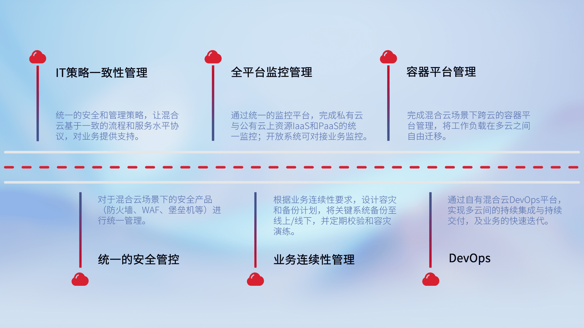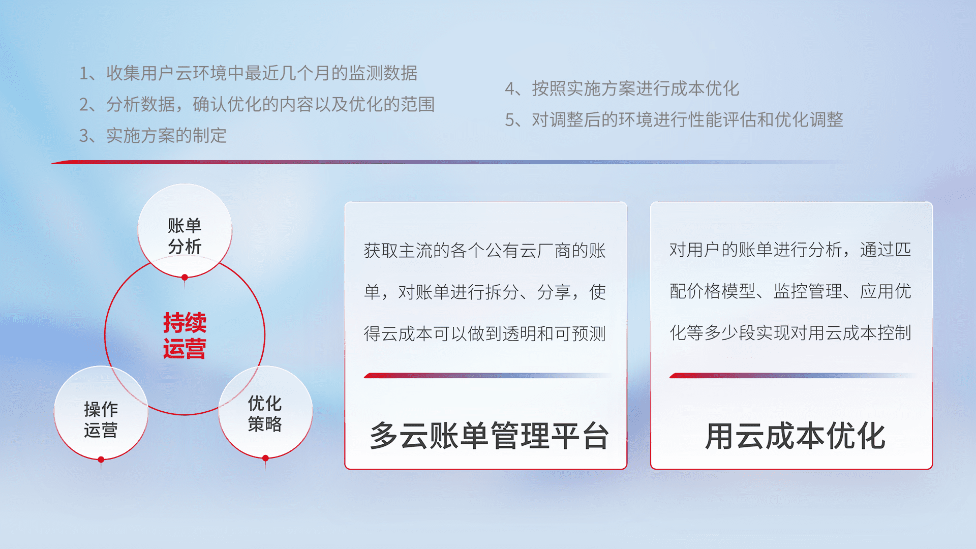 通过多云纳管,,,以统一的资源数据模型把客户的云资源进行抽象和封装,,,,进而实现对多云资源的统一操作,,,,保障云资源管理的可靠性、、、、稳定性与可用性。。量身定制化运维内容,,,,配置、、、开发运维、、、补丁管理、、、、备份、、、监控、、、、认证和访问管理、、、、审计和日常巡检等,,,保障在用云过程中的可靠度,,,,稳定度以及高可用率。。。